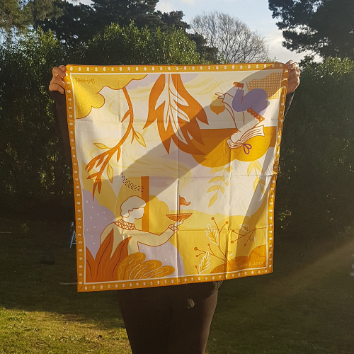 Pañuelos en 50x50cm (verde), 70x70cm (ámbar) y 90x90cm (violeta).