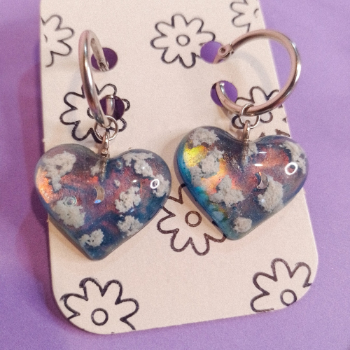 Aros de acero quirúrgico y dije de resina con nubes y cielo holográfico.