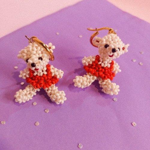 Aros de acero quirúrgico con dije de osito tejido a mano con mostacillas.